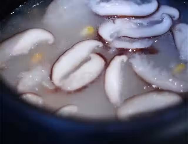 第二次煮開鍋後再繼續煮15分鐘左右後加入清洗乾淨的水果玉米粒和洗凈切片的香菇,繼續保持小火煮5分鐘左右;