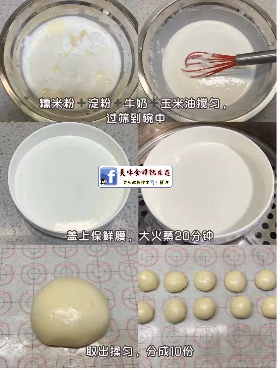 [一]糯米粉玉米澱粉砂糖牛奶玉米油,混合均勻,蓋上保鮮膜蒸20分鐘,蒸好取出,不燙手時揉勻,平均分成10個備用。