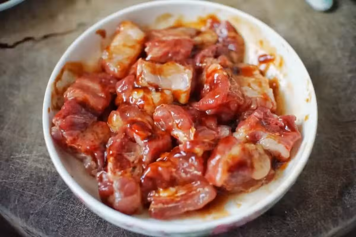 4、 把花生米鋪在盤底,然後再將切好的腌制的排骨放在花生米上面。