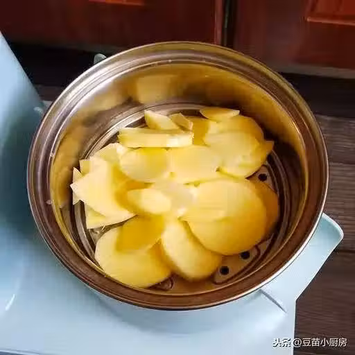 2.土豆去掉外皮後切塊,蒸鍋燒水,放入土豆塊,水開後蒸15分鐘,如果蒸的土豆多可以增加時間,蒸到用筷子一戳,透了就行。