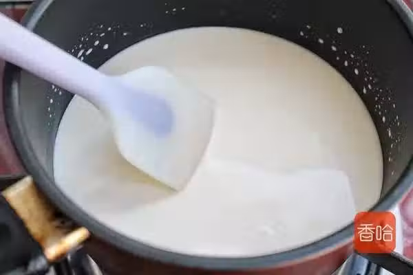 6.將攪拌均勻的牛奶澱粉倒入鍋中,並迅速與鍋中液體攪拌均勻