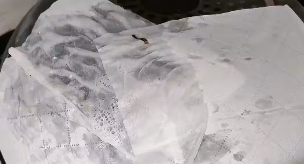 塗抹上一點之後,我們準備一張紙巾平鋪在上面,然後再次塗抹,把這個紙巾打濕,讓它貼附在炒菜鍋的底部,靜止個幾分鐘我們再來清潔。