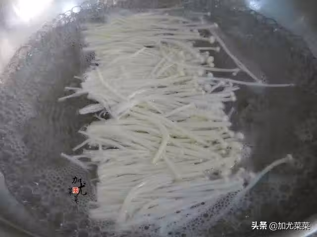 3、金針菇洗凈切去根部,香蔥和小米椒沖洗乾淨切成小絲狀,大蒜去皮拍扁切碎備用。鍋里水燒開後,下金針菇大火焯水30秒起鍋。