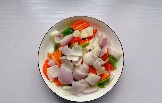 2.青紅椒,洋蔥切小塊,大蒜切片,香蔥切段。