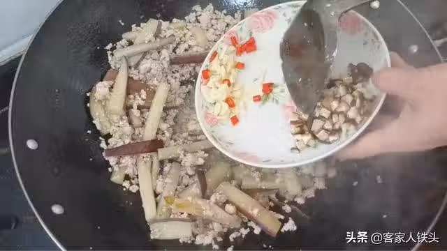 第四步:翻炒均勻後,準備一個小砂鍋,把炒好的肉末茄子轉到砂鍋中,再把苦瓜瀝干水分,然後一起加入砂鍋中,最後加入一碗清水。