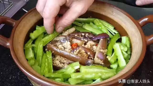 第五步:蓋上鍋蓋,調大火燒開,燒開後調成中火,煲8分鐘,苦瓜切的小條,茄子和肉末是炒熟了的,煲8分鐘,苦瓜也煲軟了,這樣做出來的苦瓜和味道都很好。