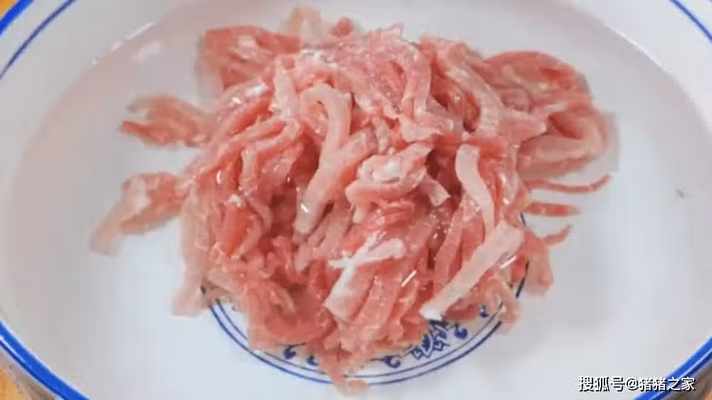 2.肉絲切好後放入碗中,用清水清洗掉肉絲裡面的血水,然後用力擠干水分後放入盤中抖散,加入少許鹽,把肉絲抓拌至上勁有韌性,抓至肉絲有一點粘手的時候,加入少許的胡椒粉和生抽,再次抓拌均勻,讓肉絲充分吸收料汁。