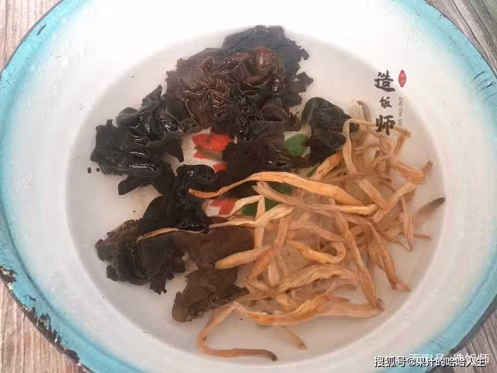 第四步:將泡好的黑木耳去蒂撕成小朵,黃花菜擠干水分備用。