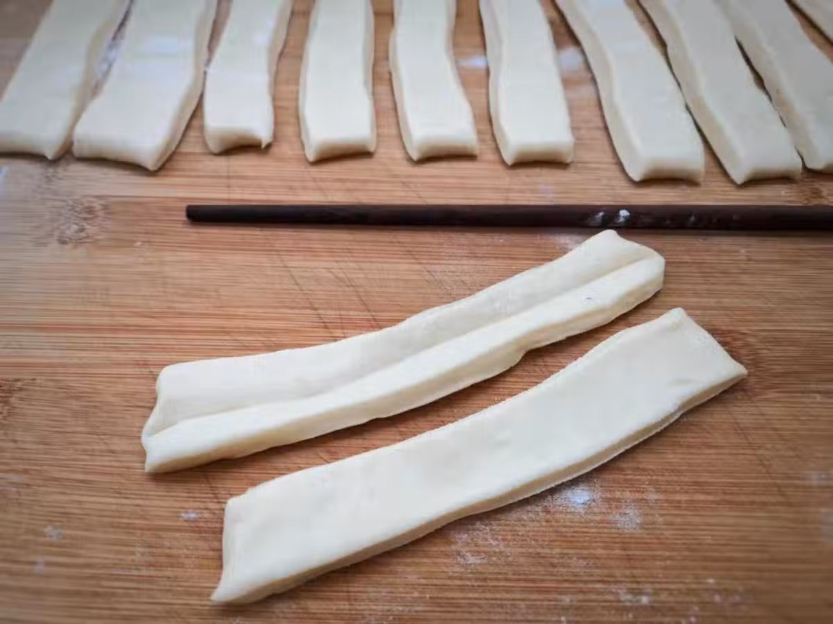 7、另拿一根乾淨無水的筷子從中間壓一下,讓兩條面粘在一起,切記兩頭不要捏緊,油條生坯做好了。