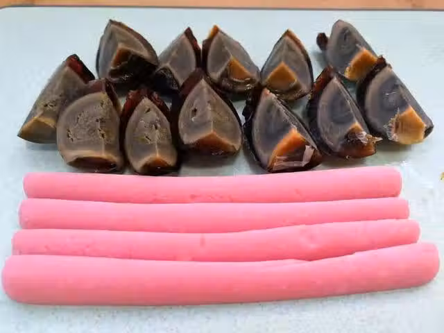 4、找了長方形的容器里舖上一層保鮮膜或者底部抹上油,方便後期脫模,把切好的松花蛋擺在容器中,火腿腸條擺在松花蛋中間,將蛋清倒入容器內。