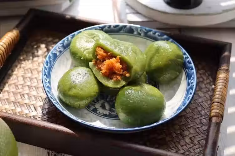 青團,外面是軟糯Q彈、清香十足的艾草味道,裡面則是包裹上自己喜歡的餡料,咬一口味道豐富,也不怎麼甜,深受男女老少的喜愛。