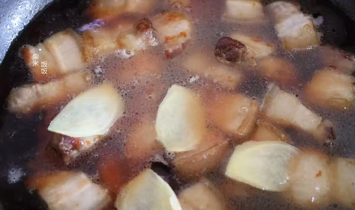 9,待五花肉燉熟,倒入土豆塊,再加入適量鹽調味,繼續小火將土豆燉熟。