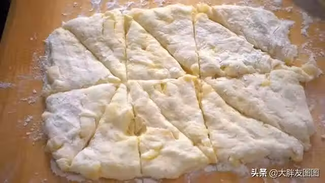 分割成很小的三角塊。也可以是任何你喜歡的形狀,擺進烤盤以後要間隔開。