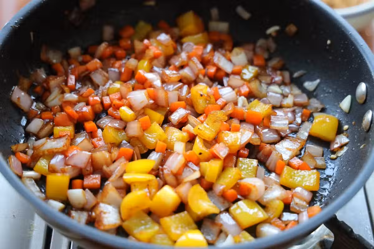 5、翻炒均勻之後推到一邊,再把西紅柿加進去翻炒出汁水;