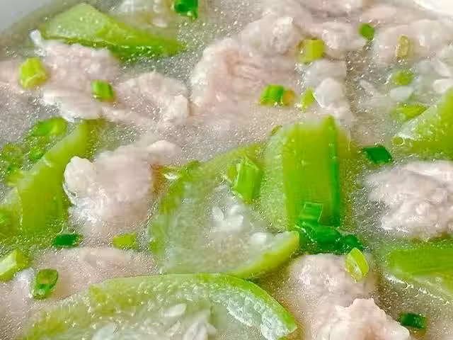 3、絲瓜煮熟後放入腌制好的肉片煮一會兒,肉片煮至定型後再繼續煮3分鐘煮熟。最後加入食鹽和胡椒粉調味,攪拌幾下煮入味即可出鍋開吃。