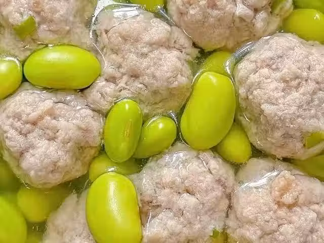 2、毛豆剝掉外殼,清洗乾淨瀝干水分。鍋中水開,先放入毛豆煮3分鐘煮熟斷生,再轉成小火,把腌制好的肉末團成肉丸,放進來煮。