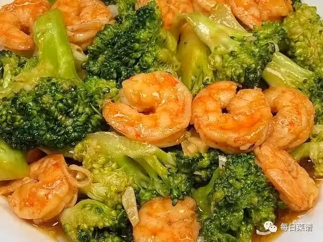 5、接著鍋中底油爆香蒜末,然後放入蝦仁和西蘭花,倒入醬汁翻炒均勻入味,煮至醬汁濃稠即可出鍋裝盤。