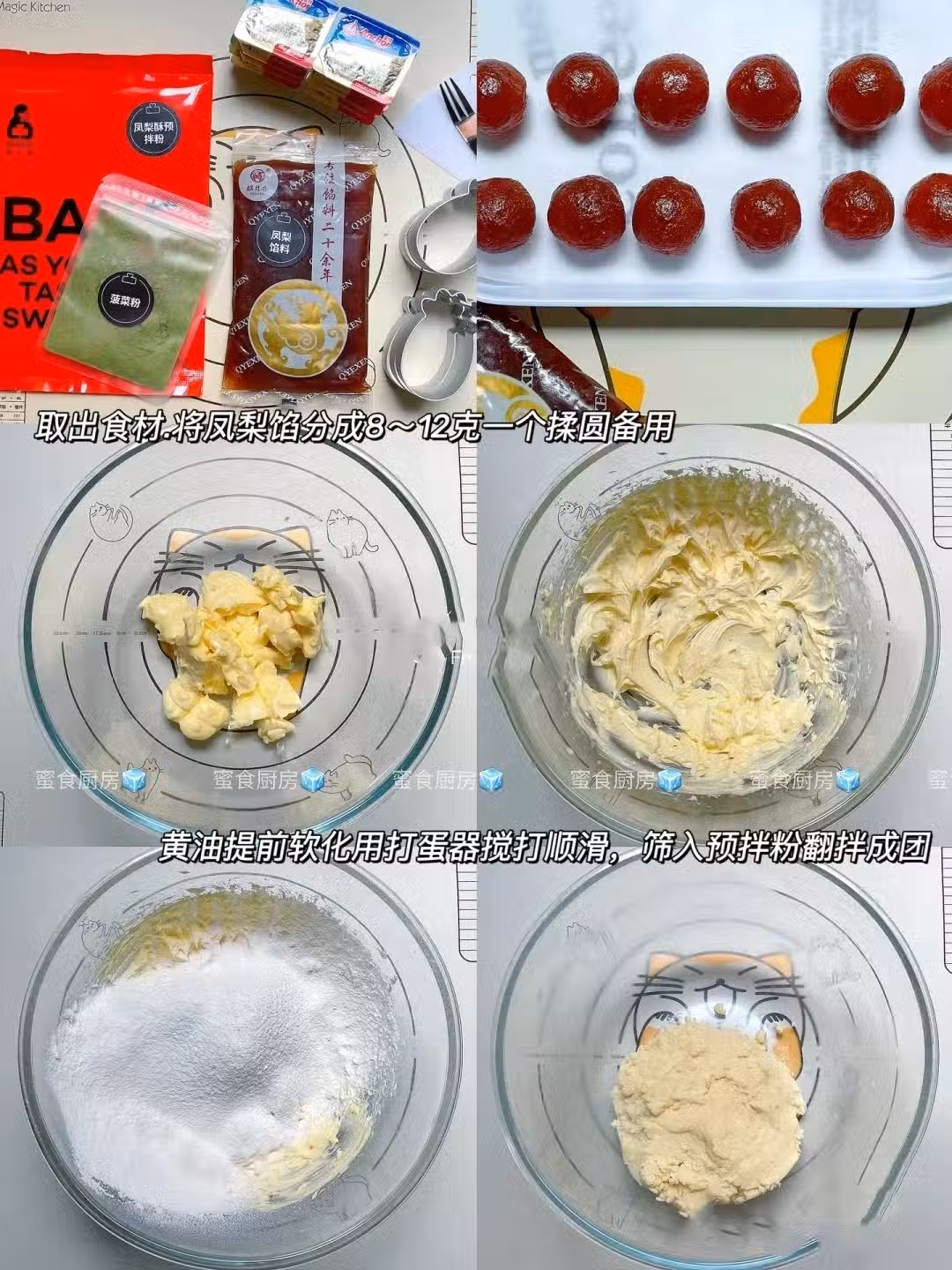 2 )碗中加入軟化的黃油用打蛋器攪打順滑,篩入 預拌粉翻拌均勻成團.均分成三份,其中兩份分別搓成長條均分成16~18克一個揉圓.另一份加入菠菜粉或抹茶粉揉勻,分成8克一個備用