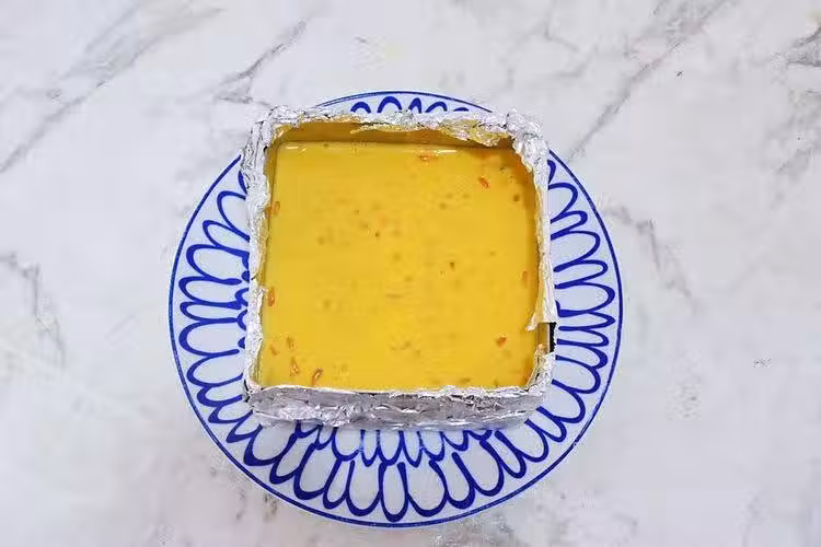 9、將芒果泥放入模具中,然後均勻地撒在模具中。