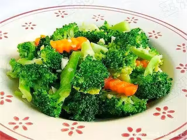 步驟3.鍋中放水,燒開,加入一點鹽和植物油,放入西蘭花和胡蘿蔔汆燙幾秒鐘,稍微變色了立刻撈出。