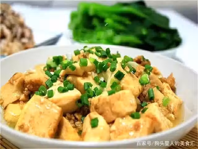 所需材料:嫩豆腐一塊,豬後腿肉150克,蔥2根,辣椒干適量,鹽適量,醬油耗油適量,澱粉適量。