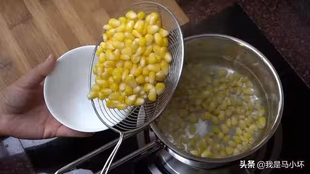 5、把玉米粒用開水焯燙1分鐘,這樣可以去除些許水分,蒸的時候不會出水。