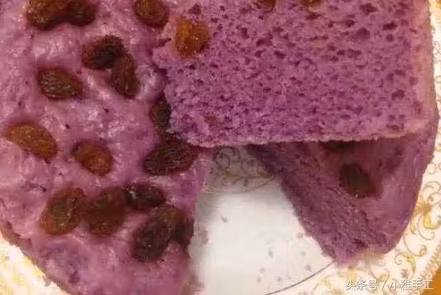 原料:紫薯210克、麵粉300克、白糖30克、乾酵母5克、牛奶約230克、藍莓干、地瓜脯