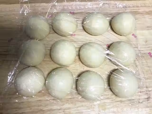 13、依次將其它的滾圓的小麵糰分別如上述所操作,依次卷好,蓋好保鮮膜,如圖所示。