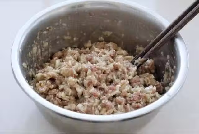 第六步,用手托住擀好的餅皮,放上一些肉餡,像包餃子一樣捏合邊緣,用餅皮包住肉餡,做成如圖片所示的肉餅狀。