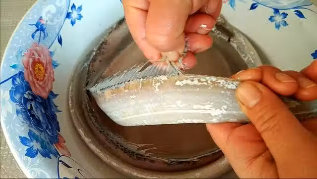 3、帶魚鰭最好用手抻出來,這樣裡面的刺就跟著出來了,再把帶魚一面切上花刀,不要切斷,另一面繼續切,切到第六刀的時候切斷,這樣一個帶魚段就切好了。