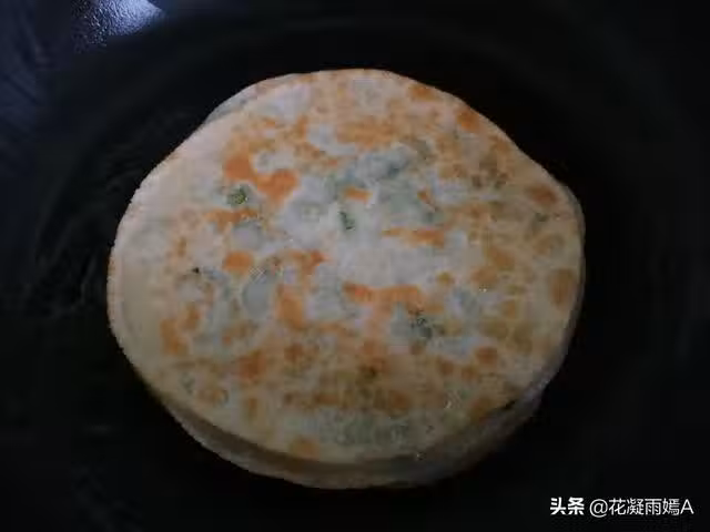 第七步:平底鍋里放油,把做好的蔥花餅放進去,烙至兩面金黃熟透即可,如果覺得餅太厚不好烙熟,可以放6層餃子皮,後來做的兩個就放了6層餃子皮,熟得很快。
