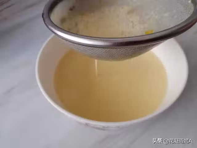 7.把牛奶雞蛋液用濾網過濾一下,這樣蒸好的布丁,會更細膩。