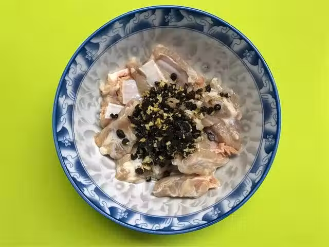 10、30分鐘後把腌好的排滑放在金針菇上,撒上小米椒粒,放入蒸鍋中蒸30-40分鐘。