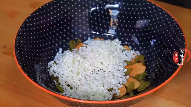 5,繼續撒上葡萄乾,也可以加上一些核桃碎或者花生碎,口感也很棒,用勺子把糯米壓得緊實一些,然後繼續重複放上糯米,撒上紅糖,鋪上葡萄乾和紅棗,最後倒入剩下的糯米鋪均勻,撒上紅糖。