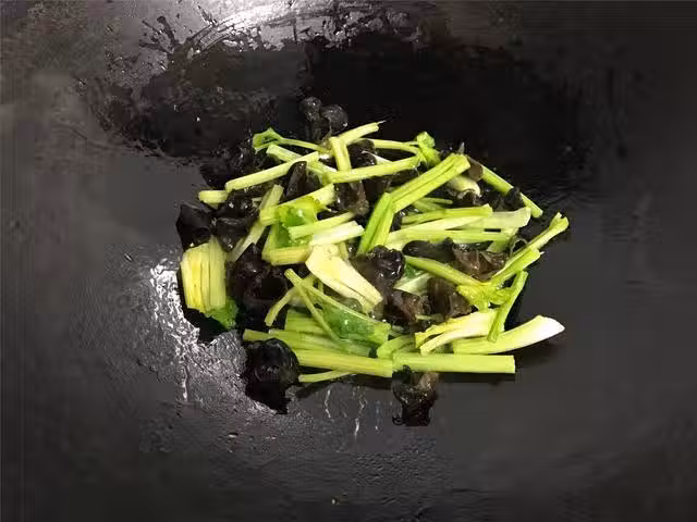 4、然後把腐竹一起放入鍋中,翻炒均勻,加入1勺生抽和少許鹽調味。