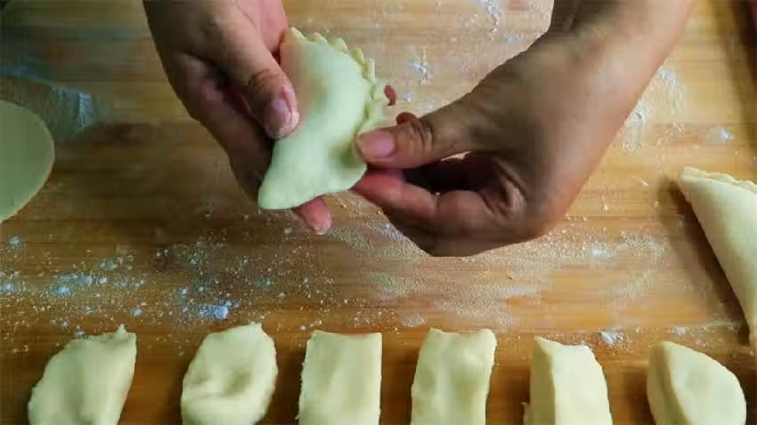 5.下面就是關鍵的步驟了,韭菜盒子邊緣如果怕捏不牢,怕開裂,那就像我這樣捏上小褶,用手指頭輕攆,一捏,就形成漂亮的花邊,還能防止不開裂,不漏水。