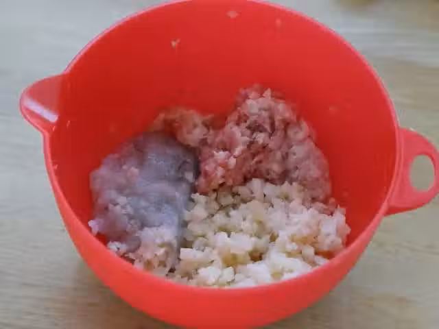 5.拌好後盛到另一個碗中,還有22個半隻蝦仁放在邊上。