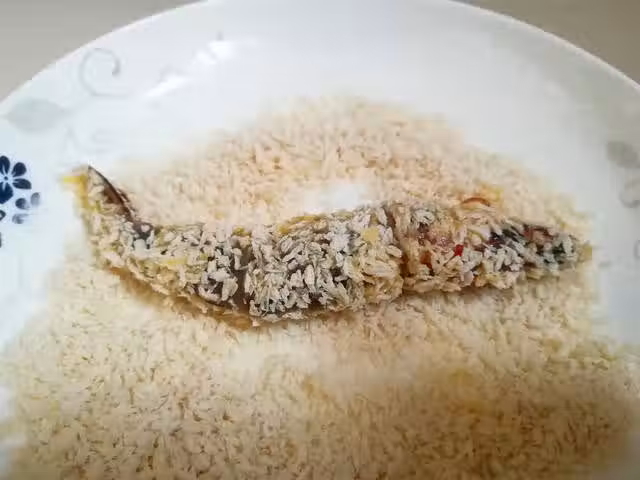 再放在麵包糠里,再裹上一層麵包糠,把大蝦放在手掌上,用兩手壓一下,這樣防止麵包糠炸制時脫落。