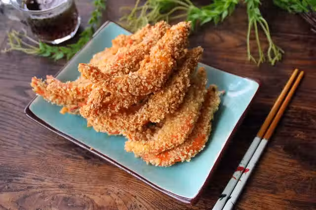 小貼士:大蝦先腌制一下,可以去除大蝦得腥味,裹上一層麵包糠,把大蝦放在手掌上,用兩手壓一下,這樣防止麵包糠炸制時脫落。炸制大蝦時,要控制一下油溫,先下入大蝦炸制定型,再用中小火炸制大蝦,一直用大火,容易把大蝦炸得外焦里不熟。