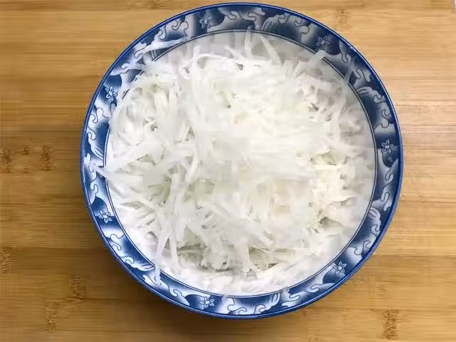 4、取一鍋,加水煮開後把蘿蔔絲放鍋中焯下水,焯水可以去掉蘿蔔味。