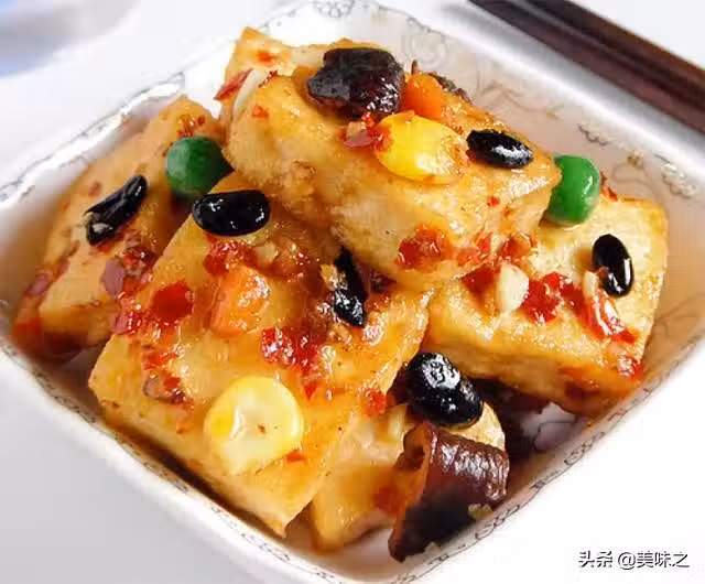 豆腐一塊、香菇數朵、玉米少許、胡蘿蔔少許、青豆少許、豉香辣醬2勺、料酒少許。