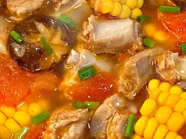 準備食材:番茄,玉米,排骨,香菇,薑片,蔥段,蔥花。