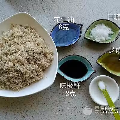 6、90分鐘左右撕完了,把右邊的調味料加在肉絲中拌勻,量根據口味可以適當調整,請一定一定要撕成蓬鬆的細肉絲。
