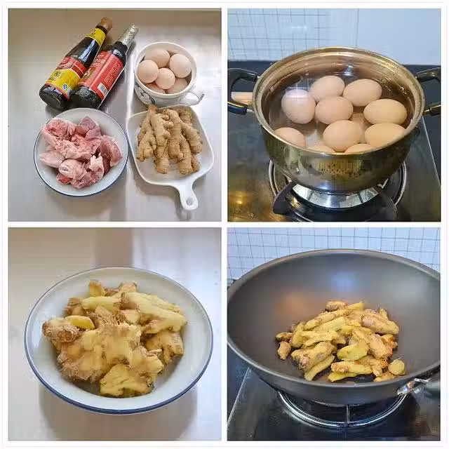 5,炒好的姜倒入大的砂鍋,再加入剝殼的雞蛋,倒入一瓶甜醋和1/3陳醋,然後煲開,轉小火煲30分鐘,關火放涼浸泡至少一晚,讓姜味充分泡出來。