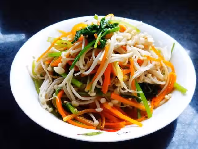 主料:金針菇、胡蘿蔔、芹菜、醋、蒜末、生抽、辣椒油、香油、鹽
