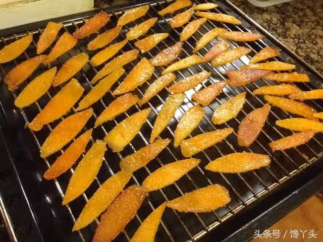 把糖漬橙皮一片一片夾到網架上晾乾,如圖。至少1,2個小時,表皮摸起來不粘手指,就可以了。如果還太濕,也可以放入烤箱裡低溫90度進行烘烤,直到表皮透亮,摸起來不粘才行。