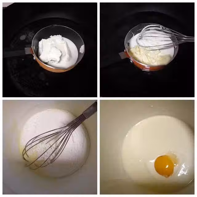 1.取一個奶鍋放入奶油乳酪和牛奶,放在一大鍋熱水內,用手動打蛋器攪拌均勻,再加入黃油,繼續攪拌均勻。