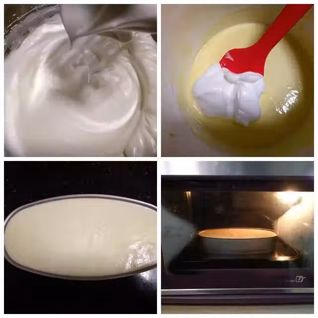 3.蛋白加入幾滴白醋,分三次加入糖,打發至能拉出軟的彎鉤的狀態。蛋白糊分三次加入蛋黃糊,翻拌均勻成乳酪蛋糕糊。
