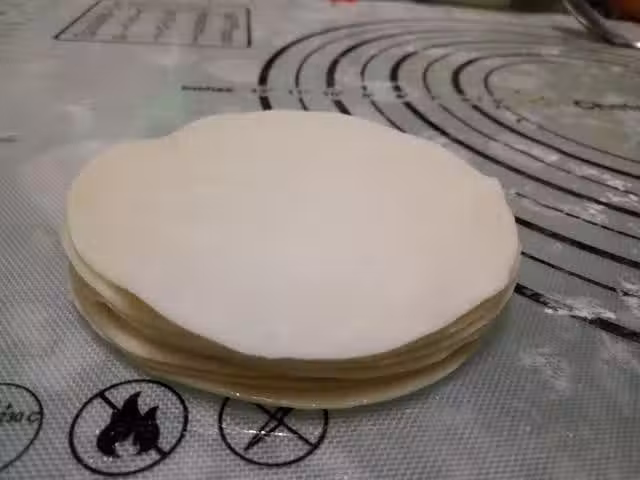 3.按一下,然後用擀麵杖稍微擀大一些,最上面一張擀得不大,也沒關係的。