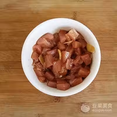 1、豬裡脊肉切成比大拇指指甲略大的小塊,加入薑片、少許鹽、生抽、料酒、白鬍椒粉、一點植物油抓勻,腌制20分鐘。